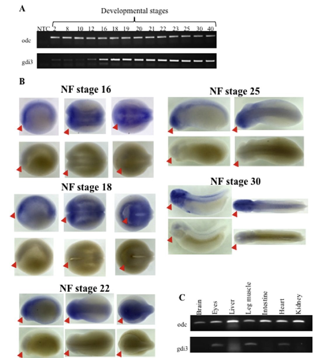 are shown in the lateral and dorsal view only. (C) Analysis of GDI3 expression in adult Xenopus tropicalis tissues show presence of mRNA in the eyes, leg muscle and heart but not in