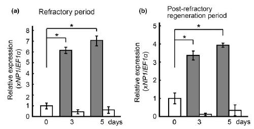 Real-time RTâPCR of xNP1-transcripts in tail tissues of the ârefractoryâ and âpost-refractory regenerationâ period tadpoles on days 0, 3, and 5 after amputation. Real time RTâPCR was performed using total RNA extracted from the tail stumps (2-mm wide tail tissues) of the (a) ârefractoryâ and (b) âpost-refractory regenerationâ period tadpoles on days 0, 3, and 5 after amputation. As a control, we used total RNA extracted from tissues of the same tail parts: for example, 2-mm wide tissues at the distal one-third of the intact tails from tadpoles at the same developmental stages, on days 3 and 5 after the tails of the experimental group were amputated. The shaded and open bars indicate amputated tail stumps and intact tails, respectively. The numbers of individuals used for the experiments were: 16â24 à 3â4 lots and 2â5 à 2â4 lots for ârefractoryâ and âpost-refractory regenerationâ periods, respectively. The relative amounts of xNP1 transcripts determined by real-time RTâPCR were obtained by taking the value at day 0 as 1 for each (a) ârefractoryâ period and (b) âpost-refractory regenerationâ period after normalization relative to elongation factor 1α (EF1α) transcript levels. The bars indicate standard errors. Asterisks indicate statistically significant differences: P < 0.05 using the Tukey-Kramer method. image, Intact tails; image, Amputated tail stumps.