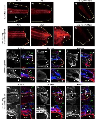 Expression analysis by immunostaining of xNP1 in the amputated tail stumps and regenerating tails of the ârefractoryâ and âpost-refractory regenerationâ period tadpoles. Immunostaining was performed using amputated tail stumps of the refractoryâ period tadpoles on (a) day 0 and (b and c) days 2 after amputation, and regenerating tails of the âpost-refractory regenerationâ period tadpoles on (d) day 0 and (eâg) days 3 after amputation, with the anti-xNP1 antibody (a, b, dâf) or the same concentration of normal IgG as negative controls (c and g), respectively. The yellow lines indicate outlines of the sampled tails. Panel (f) indicates a magnified view of the boxed area in (e). The arrowhead in panel (f) indicates regenerating notochord. We also performed immunostaining on sectioned tails of (hâj) the ârefractoryâ period and (kâm) the âpost-refractory regenerationâ period tadpoles at 10, 24 and 48 h after amputation. (hâm) Upper left, immunofluorescence images of xNP1 staining; Upper right, merged images of xNP1 staining (red) and Hoechst 33342 staining (blue). the position of the tissues is indicated with colored and dashed lines. sc (light blue), spinal cord; nc (yellow), notochord; ms (gray), mesenchyme; ep (green), epidermis; Lower left, magnified view of xNP1 staining of the boxed area in upper right; Lower right, magnified view of merged images of the boxed area. Arrowheads in (hâm) indicate signals. The bars indicate (aâc) 1 mm, (d, e and g) 0.5 mm, and (hâm) 0.2 mm, respectively.