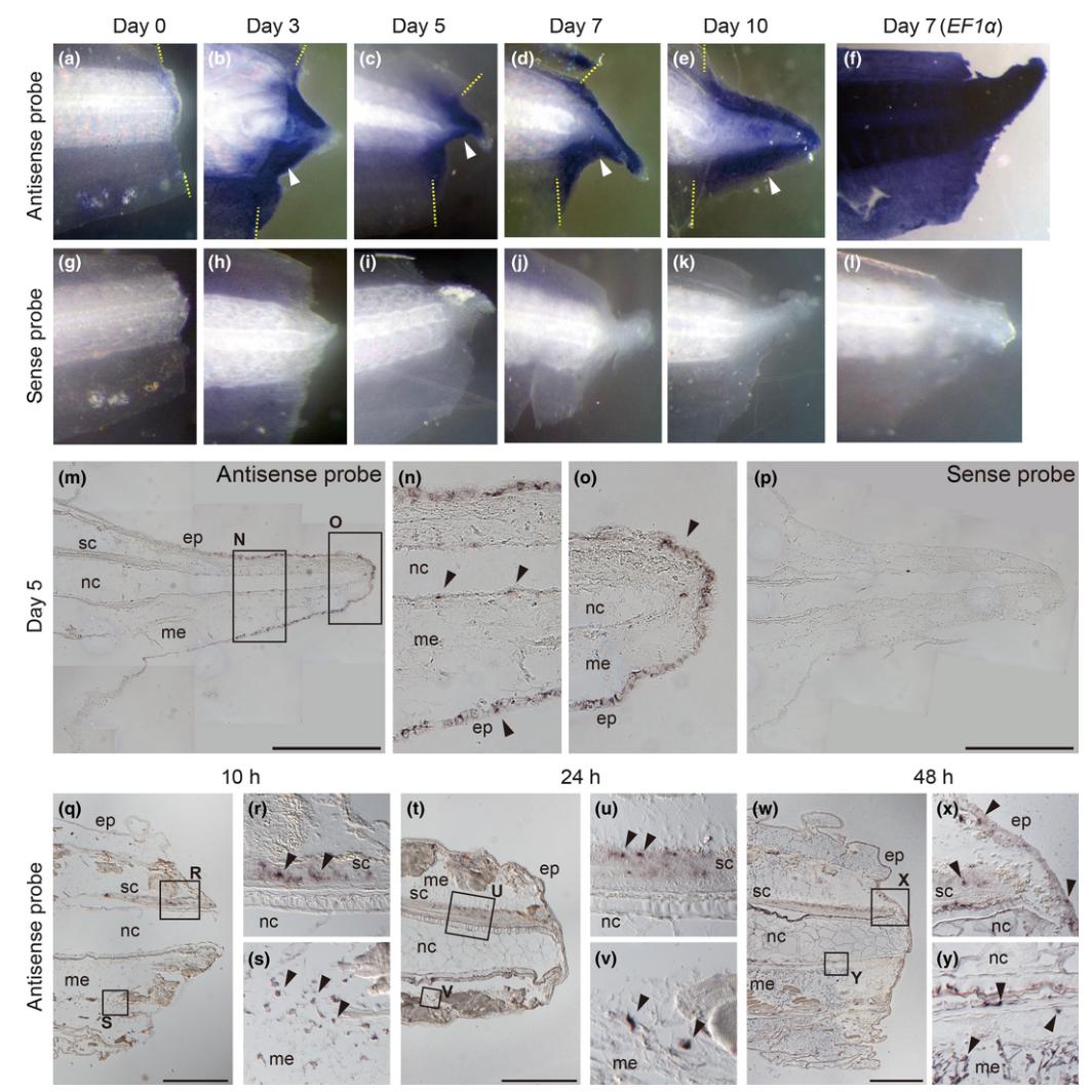 In situ hybridization of xNP1-transcripts in regenerating tails of the âpost-refractory regenerationâ period tadpoles within 10 days after amputation. Whole mount in situ hybridization was performed using the regenerating tails of âpost-refractory regenerationâ period tadpoles on (a and g) day 0, (b and h) days 3, (c and i) days 5, (d, j, f and l) days 7, and (e and k) days 10 after amputation, with (aâe) antisense or (gâk) sense DIG-labeled xNP1 probe. Arrowheads in (bâe) indicate signals. Yellow dash lines in (bâe) indicate amputation plane. As positive and negative controls for hybridization, the regenerating tadpole tails on day 7 after amputation were hybridized with (f) antisense or (l) sense DIG-labeled EF1α probe. xNP1 expression in the regenerating tail on day 5 after amputation was also examined by section in situ hybridization using (mâo) antisense or (p) sense DIG-labeled xNP1 probes. (n and o) are magnified views of boxed areas in (m). We also performed in situ hybridization on 10, 24 and 48 h after amputation (qây). (r and s), (u and v), (x and y) are magnified views of boxed areas in (q, t and w), respectively. The orientation of the specimen is; left, anterior; right, posterior; top, dorsal; and bottom, ventral. The bars in (m, p, q, t and w) indicate 0.5 mm. Arrowheads in (n, o, r, s, u, v, x and y) indicate signals. ep, epidermis; me, mesenchyme; nc, notochord; sc, spinal cord.
