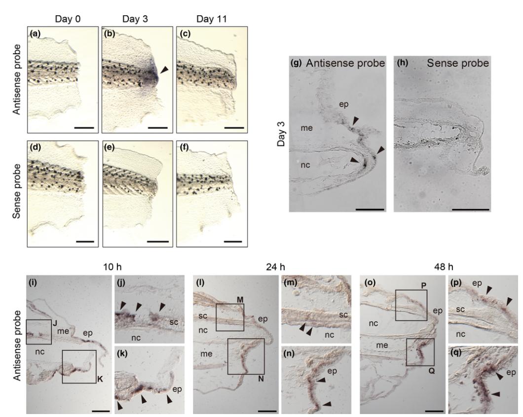In situ hybridization of xNP1 transcripts in wound tail stumps of the ârefractoryâ period tadpoles after amputation. Whole mount in situ hybridization was performed using amputated tail stumps of the ârefractoryâ period tadpoles on (a and d) day 0, (b and e) days 3, and (c and f) days 11 after amputation, with (aâc) antisense or (dâf) sense DIG-labeled xNP1 probe. xNP1 expression in the amputated tail stumps on 3 days after amputation was also examined by section in situ hybridization using (h) antisense or (i) sense DIG-labeled xNP1 probes. We also performed in situ hybridization on 10, 24 and 48 h after amputation (iâq). (j and k), (m and n), (p and q) are magnified views of boxed areas in (i, l and o), respectively. The bars indicate (aâf) 1 mm and (g, h, i, l and o) 0.1 mm, respectively. The orientation of the specimen in each panel was the same as in Figure 3. Arrowheads in each panel indicate signals. ep, epidermis; me, mesenchyme; nc, notochord; sc, spinal cord.