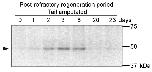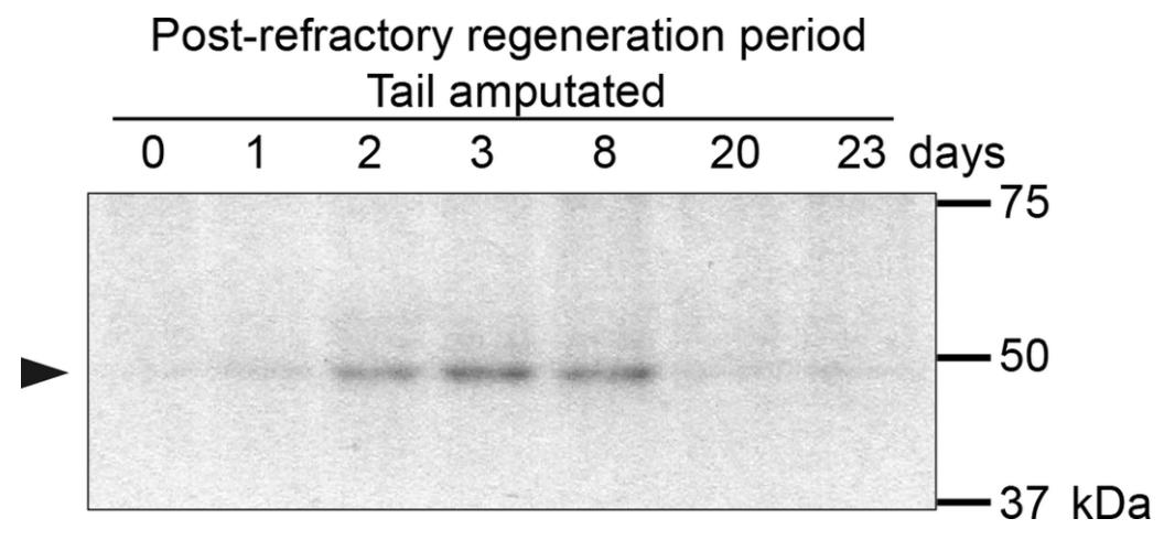Immunoblotting of xNP1 in the regenerating tails of the âpost-refractory regenerationâ period tadpoles. Immunoblotting was performed using homogenates of regenerating tails of the âpost-refractory regenerationâ period tadpoles on days 0, 1, 2, 3, 8, 20, and 23 after amputation, and the anti-xNP1 antibody. The positions of bands for xNP1 are indicated with an arrowhead. The numbers at the right of panels indicate positions of molecular weight markers in kDa.