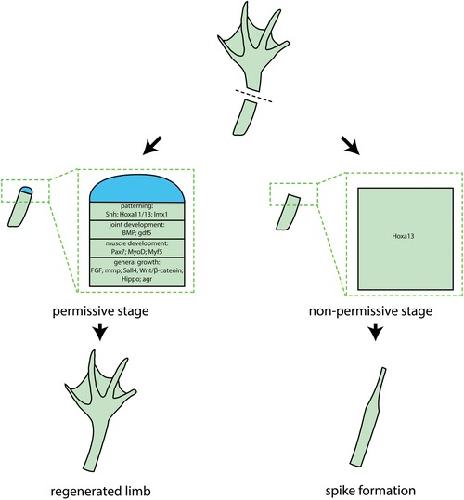 Figure 4. Xenopus as a model to compare regenerative and non‐regenerative limbs. Before metamorphosis, Xenopus froglets are capable of regenerating amputated limbs. Listed are required genes and pathways in different processes of limb regeneration, including growth, patterning, joint and muscle development. Post‐metamorphic froglets enter a non‐permissive stage of limb regeneration when amputated limb can only grow into a spike instead of a restored limb. Many of the upregulated genes and activated pathways in the permissive stage are not properly expressed or activated at the non‐permissive stage |