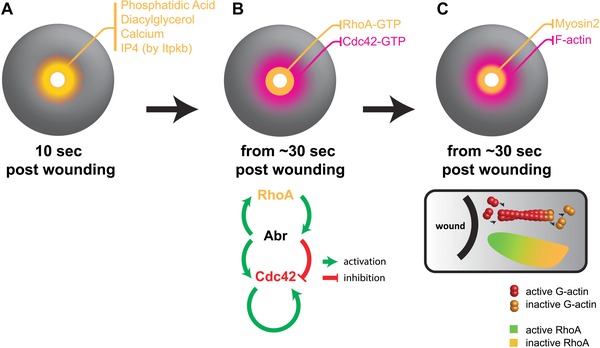 Figure 1. Single‐cell wound responses. (A) Immediate signals, including calcium, IP4, and others, are produced in a gradient at the wound edge, upstream of the cytoskeletal signaling. (B) From 30 sec post wounding onwards, small Rho GTPases Cdc42 and RhoA are activated at the wound edge. Spatial patterning of the circumferential rings of Cdc42 and RhoA is regulated by Abr, a dual‐functional GAP/GEF, which separates active Cdc42 and active RhoA into an outer ring and an inner ring, respectively. (C) Cytoskeletal machinery in single‐cell wound closure. Myosin‐2 and F‐actin also accumulate circumferentially at the wound edge, and the closure of this actomyosin ring is driven by a centripetal gradient of RhoA activity (box). Reciprocally, this RhoA activity is also regulated by treadmilling of the actin filaments at the wound edge |