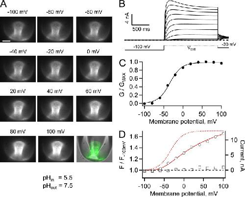 Figure 1. Patch-clamp fluorometry of Venus-Hv1. (A) Fluorescence images of an inside-out patch held at the indicated membrane potential. The image in the bottom right corner is a superposition of the fluorescence image at 100 mV (green) and the transmitted light image of the pipette to show the location of the membrane patch within the pipette. Bar, 10 µm. (B) Proton currents from the patch in A elicited by depolarizing voltage-clamp pulses. (C) Conductance versus voltage curve derived from the currents in B. The continuous line is a fit to Eq. 2 with parameters qa = 1.63 eo and V0.5 = −33.8 mV. (D) Fluorescence measured from the whole patch area at each voltage was normalized to the fluorescence at −100 mV (circles). A ratio greater than one indicates an increase (dequenching) of the fluorescence. The fluorescence of a region of membrane attached to the pipette but outside of the patch is also plotted (squares). The red continuous line is the I-V curve from the currents in A, whereas the red dashed curve is the fit to the G-V curve in C. The bath solution contained 100 mM MES buffer, and the pH of solutions is indicated.