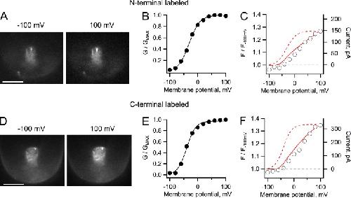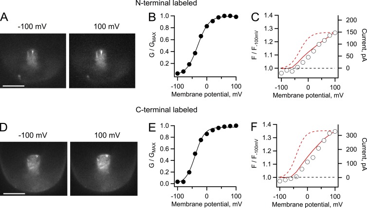 Figure 2. Patch-clamp fluorometry of Venus-Hv1 and Hv1-Venus constructs. (A) Fluorescence images of an inside-out patch from an oocyte expressing Hv1 channels labeled with Venus in the N terminus. The patch was held at the indicated membrane potential. (B) G-V curve from proton currents from the patch in A elicited by depolarizing voltage-clamp pulses. The continuous line is a fit to Eq. 2 with parameters qa = 1.31 eo and V0.5 = −31.2 mV. (C) Fluorescence measured from the whole area of the patch in A at each voltage, plotted as normalized intensity with respect to the fluorescence intensity at −100 mV. (D) Fluorescence images from an inside-out patch from oocytes expressing the Hv1 construct labeled at the C terminus. (A and D) Bars, 10 µm. (E) G-V curve from proton currents from the same patch in D elicited by depolarizing voltage-clamp pulses. The continuous line is a fit to Eq. 2 with parameters qa = 1.56 eo and V0.5 = −39.6 mV. (F) Fluorescence measured from the whole patch area and analyzed as in C. For the analysis in C and F, a ratio greater than one indicates an increase (dequenching) of the fluorescence as the patch is held at increased positive potentials. The red continuous line is the I-V curve from the currents in the corresponding patch, whereas the dashed curve is the fit to the G-V curve. The buffer concentration for these experiments was 10 mM MES, and the pH gradient is as in Fig. 1.