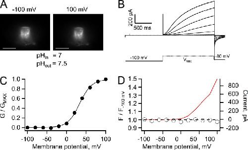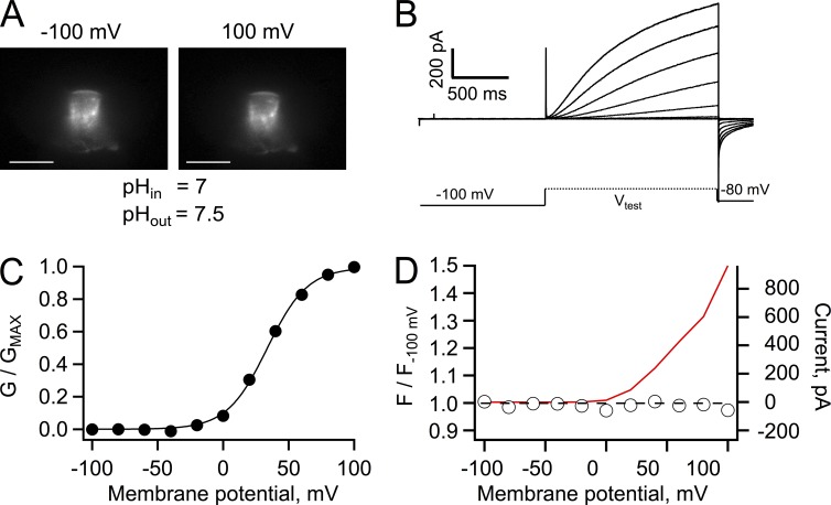 Figure 3. Patch-clamp fluorometry of Venus-Hv1 at pHi 7. (A) Fluorescence images of an inside-out patch held at the indicated membrane potential. Bars, 10 µm. (B) Proton currents from the patch in A elicited by depolarizing voltage-clamp pulses, as indicated by the schematic protocol. (C) Conductance versus voltage curve derived from the currents in B. The continuous line is a fit to Eq. 2 with parameters qa = 1.62 eo and V0.5 = 33.6 mV. (D) Fluorescence measured from the whole patch area at each voltage was normalized to the fluorescence at −100 mV. A ratio equal to one at all voltages indicates the absence of dequenching of the fluorescence of Venus. The red continuous line is the I-V curve from the currents in B. The bath solution contained 10 mM HEPES buffer.