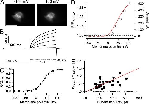 Figure 6. Recovery of fluorescence dequenching in VenusH148G-Hv1 at pHi 7. (A) Fluorescence images of an inside-out patch from an oocyte expressing the construct VenusH148G-Hv1 held at the indicated membrane potential. Bar, 10 µm. (B) Proton currents from the patch in A elicited by depolarizing voltage-clamp pulses. (C) Conductance versus voltage curve derived from the currents in B. The continuous line is a fit to Eq. 2 with parameters qa = 1.47 eo and V0.5 = 35.4 mV. (D) Fluorescence dequenching measured from the whole area of the patch in A. The red curve is the I-V curve for the same patch. (E) The fluorescence from 28 patches similar to A was measured at 80 mV, normalized to the fluorescence at −100 mV, and plotted as a function of the current magnitude at 80 mV, as in Fig. 4. A ratio greater than one at all voltages indicates dequenching of the fluorescence of VenusH148G. The bath solution contained 10 mM HEPES buffer. The continuous red line is the predicted dequenching by Eq. 4 with parameters rp = 10 µm, ro = 5 µm, lp = 15 µm, Ka = 2.81 × 10−8, αo = 0.26, fpKa = 7.6, DBH = 5 × 10−10 m2/s, and Btotal = 10 mM.
