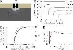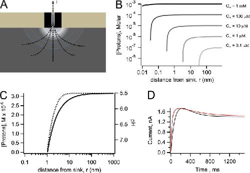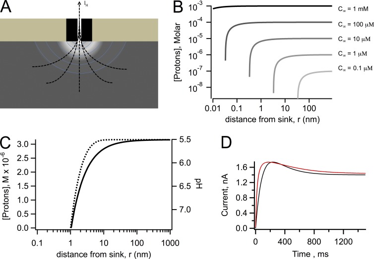 Figure 7. Diffusion model calculations. (A) Schematic representation of the proton depletion zone generated by an outward proton current through an Hv1 channel. (B) Calculations using Eq. 5 of the extent of the depletion of protons as a function of the radial coordinate, r, for different values of the bulk proton concentration, c∞, as indicated; the value of q = 14 fA is the same for all curves as well as DH = 7,000 µm2/s. (C) Calculation of the effect of the presence of buffer. The black curve was calculated with DH = 7,000 µm2/s and Eq. 5. The effect of the presence of buffer is illustrated by the dotted line, which was calculated with Eq. 6. The values of the constants are c∞ = 3.16 µM, [B] = 100 mM, a = 1 nm, kb = 1010 M−1s−1, and DH = 7,000 µm2/s. Data are presented as molar proton concentration (left axis) and corresponding pH (right axis). (D) Experimental (red) and simulated (black) currents in response to a 100-mV depolarization. Simulated current trace was generated taking into account a pH change during current development of 1 pH unit, which changes the single-channel current from 5 fA to 1.4 fA. The current is given by Eq. 7 in the form I(H,t)=N·(1−e−t/τ)[5−(5−1.4)(1−e−t/τ)], with τ = 200 ms and N as an arbitrary whole number chosen to match the size of the experimental current.