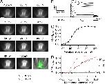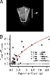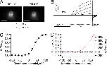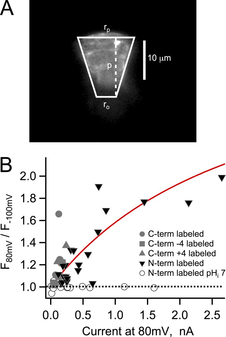 Figure 4. Fluorescence dequenching and proton depletion. (A) Fluorescence image of a typical patch expressing Hv1-Venus and approximation of its geometry by a truncated cone with the indicated dimensions used in the model in Eq. 4. (B) The value of the observed dequenching at 80 mV is plotted as a function of the current for that particular patch also at 80 mV. All of the experiments in this figure were obtained with an intracellular solution of pH 5.5, with the exception of those patches represented by the open circles. The continuous red curve is the dequenching as a function of current magnitude predicted by Eq. 4. The parameters that went into Eq. 4 were rp = 10 µm, ro = 5 µm, lp = 15 µm, Ka = 7.08 × 10−7, αo = 0.1812, fpKa = 5.6, DBH = 5 × 10−10 m2/s, and Btotal = 10 mM. The dotted line indicates lack of dequenching and describes the recordings from N-labeled channels at pHi 7.