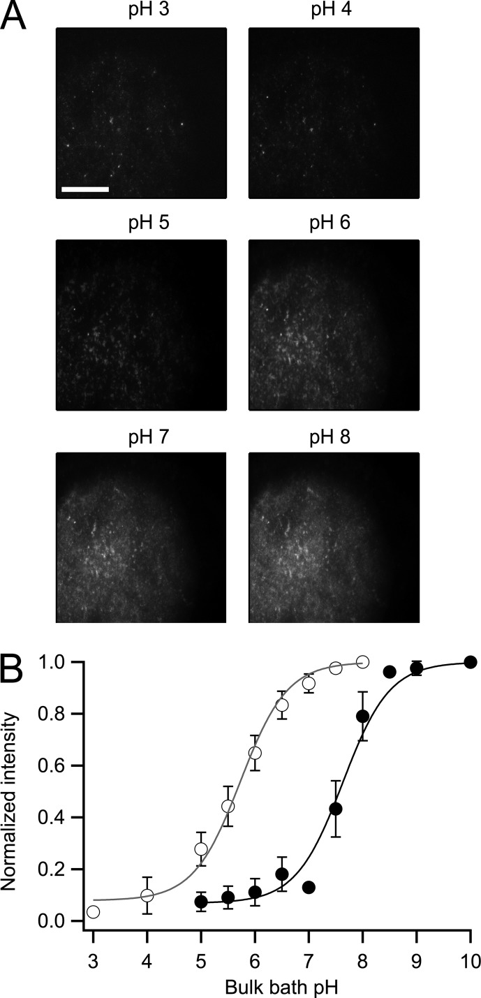 Figure 5. Measurement of the pKa of fluorescent constructs. (A) Representative membrane sheet from oocytes injected with the Venus-Hv1 construct. The membrane was imaged under different pH conditions, indicated at the top of each frame. Fluorescence was measured as the mean of an ROI encompassing a large area of the membrane sheet or from individual clusters of channels with the same results. Bar, 20 µm (same for all images). (B) The fluorescence was normalized to the value at the highest pH for each construct to build the full titration curve. The data were fitted to the titration function (Eq. 3). The pKa for Venus-Hv1 (open circles) is 5.63 and 7.62 for VenusH148G-Hv1 (closed circles). The data are the mean of five experiments for both constructs, and error bars are the standard error of the mean.