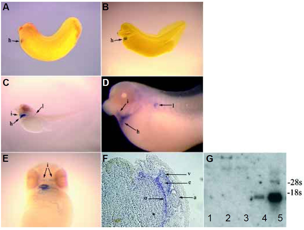 Fig. 2. Expression of MLP during Xenopus embryogenesis. (A) MLP expression is first detected at stage 27 (staged according to Nieuwkoop and Faber, 1994) in the heart (h) by whole mount in situ hybridization. (B) A stage 36 embryo showing that MLP expression (seen in blue) is still restricted to the heart at this stage. (C) At stage 40/41, MLP expression can be found in both the heart (h) and intermandibularis (i) muscle. In addition, expression was observed in the lymph heart (l) near the anteriorsomites. (D) An enlarged view of a stage 40/41 embryo showing the regions of expression in the head and clearly showing the lack of expression in the developing somites. (E) Ventral view of a Xenopus embryo showing the two patches of intermandibularis muscle spanning the lower jaw and expressing MLP. (F) A frontal section through the heart of a stage 38 embryo showing expression of MLP in the ventricle (v), atria (a) and outflow tracts (o) but not the endocardium (e). (G) Northern blot of adult intestine (1), kidney (2), liver (3), skeletal muscle (4), and heart (5) RNA probed with MLP. There was approximately equal loading in each lane based on rRNA levels. MLP expression is restricted to the heart and skeletal muscle. As in mammals, a higher level of expression was observed in the heart, in which a second, larger transcript was also observed (Arber et al., 1994).