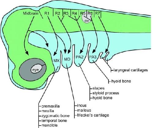 In the mammalian embryo neural crest cells delaminate from the posteriormidbrain and individual rhombomeres (R1âR7) in the hindbrain, and migrate into the pharyngeal arches (PA). Neural crest cells migrate in a stereotypical pattern based on their origin in the hindbrain (arrows). In each arch the neural crest contributes a specific set of skeletal elements as indicated. The first pharyngeal arch has two parts the maxillary (MX) and mandibular (MD) prominences. The most caudal pharyngeal arches form laryngeal cartilages. Lateral view, anterior to left, dorsal to top. ov, otic vesicle.