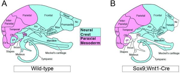 (A) Diagram showing the paraxial mesoderm (red) and neural crest (blue) contribution to the mouse headskeleton. Lateral view, anterior to right. Als, Alisphenoid; Bs, Basisphenoid; Ex, Exooccipital; Nc, Nasal capsule; Os, Orbitosphenoid; So, Supraoccipital; Sq, Squamosal (modified from Noden and Schneider, 2006). (B) Sox9;Wnt1-Cre mouse embryos have a domed skull, a short snout and short mandibles. In these animals the missing skeletal elements of neural crest origin are depicted in white.