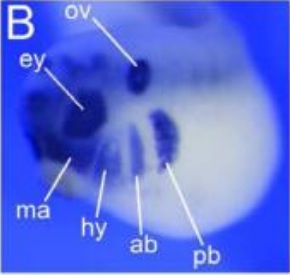 sox9 (SRY-box 9 ) gene expression in a Xenopus laevis embryo, as assayed by in situ hybridization, NF stage 28, anterioe view, dorsal up.