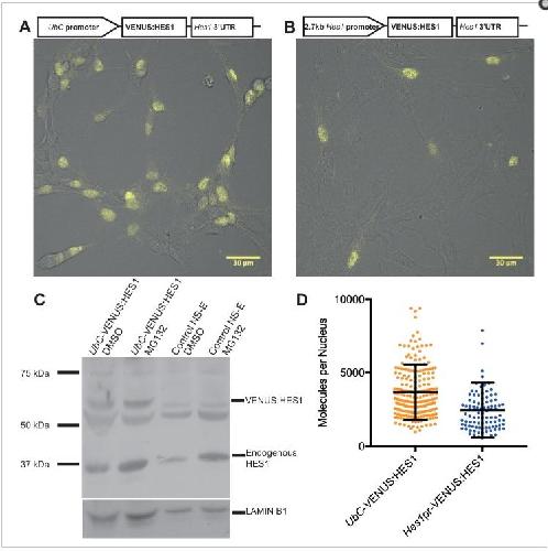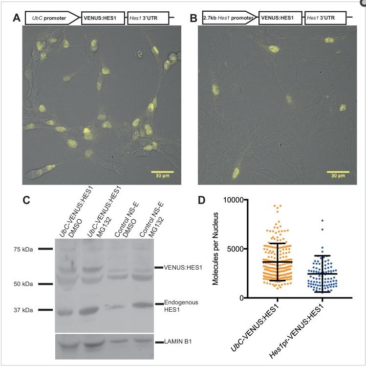 Figure 2. Quantifying HES1 protein number with FCS. Schematic and image of stably infected NS-E cells containing (A) UbC-VENUS:HES1 reporter construct and (B) 2.7 kb-Hes1pr-VENUS:HES1 reporter construct. VENUS:HES1 signal in yellow. Scale bars show 30 μm. (C) HES1 western blot with LAMIN B1 loading control. Nuclear lysates of NS-E cells stably infected with UbC-VENUS:HES1 or control NS-E cells. Both cell-lines treated with DMSO or 10 μM MG132 proteasome inhibitor for 3âhr. MG132 treated cells show increased HES1 and VENUS:HES1. (D) FCS quantification of VENUS:HES1 molecules per nucleus in stable UbC-VENUS:HES1 and 2.7 kb-Hes1pr-VENUS:HES1 reporter NS-E cell-lines. 236 cells (mean 3660 ± 120 (S.E.M) molecules) and 98 cells (mean 2450 ± 190 (S.E.M) molecules) were analysed in 4 and 2 experiments respectively. Error bars show S.D. FCS data and Western blots at different exposures are contained in Figure 2âsource data 1. |