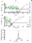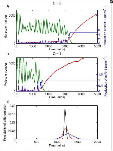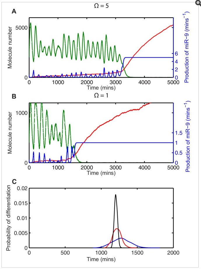 Figure 5. Stochasticity causes systematic changes to the mean time-to-differentiation. The time course of HES1 protein and miR-9 expression, compared with the production of miR-9 at a system size of (A) Ï=5 or (B) Ï=1 and simulated with the CLE. Green, protein; red, miR-9; blue, production of miR-9. All simulations performed with parameter set 2 (Appendix 1âtable 1) and initial conditions m(0) = 20xÏ, p(0) = 400xÏ and r(0) = 0. (C) The distribution of time to reach the low HES1 protein state when p1 = 700, αr = 0.25. Black, Ï=50; red, Ï=5, blue, Ï = 1. Note that here differentiation is defined to reach a miR-9 high state (r>170), as the transition to the low protein state is much less well defined. MATLAB code contained in Figure 5âsource data 1. |