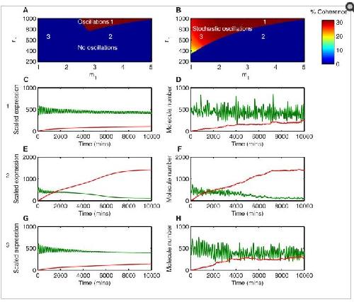 Figure 7. Stochasticity increases the parameter space where HES1 oscillates. (A) The areas of HES1 protein oscillations in the deterministic system, as a function of translation repression Hill co-efficient (m1) and translation repression threshold (r1). (B) The areas of HES1 protein oscillations in the stochastic system at the steady state as calculated by the LNA. The colour scale represents the coherence of the stochastic oscillations. (C, E, G) Deterministic simulations of the system for point 1 (m1 = 3.5, r1 = 900), point 2 (m1 = 3.5, r1 = 600) and point 3 (m1 = 1.5, r1 = 600), respectively. Green, Protein; red, miR-9. (D, F, H) Stochastic simulations (dSSA) of the system for point 1 (m1 = 3.5, r1 = 900), point 2 (m1 = 3.5, r1 = 600) and point 3 (m1 = 1.5, r1 = 600), respectively. All simulations performed with parameter set 1 (Appendix 1âtable 1) and initial conditions m(0) = 20xÏ, p(0) = 400xÏ and r(0) = 0. MATLAB code contained in Figure 4âsource data 1. |