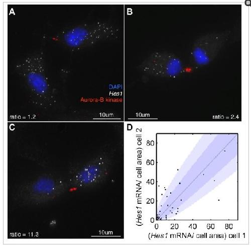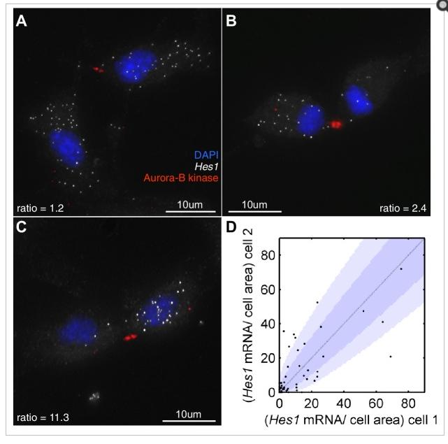 Figure 8. Hes1 mRNA is inherited unequally at cell division. (A, B, C) smFISH with an exonic Hes1 probe showing asymmetry in Hes1 mRNA number (white) between sister NS cells, just prior to their complete separation at cytokinesis. Aurora-B kinase antibody staining (red) marks the midbody at cytokinesis; nuclei are DAPI stained (blue). (D) Quantification of Hes1 mRNA to cell area ratios between sister cells from 51 NS cell divisions at cytokinesis, from one experiment. Dark blue area represents the 90% confidence bounds that the ratios are drawn from a binomial distribution, where the average amount of mRNA received by each cell is normalised to the relative cell areas. Light blue represents multiple testing Bonferroni corrected 90% confidence bounds that the ratios are drawn from a binomial distribution. mRNA count data contained in Figure 8âsource data 1. |