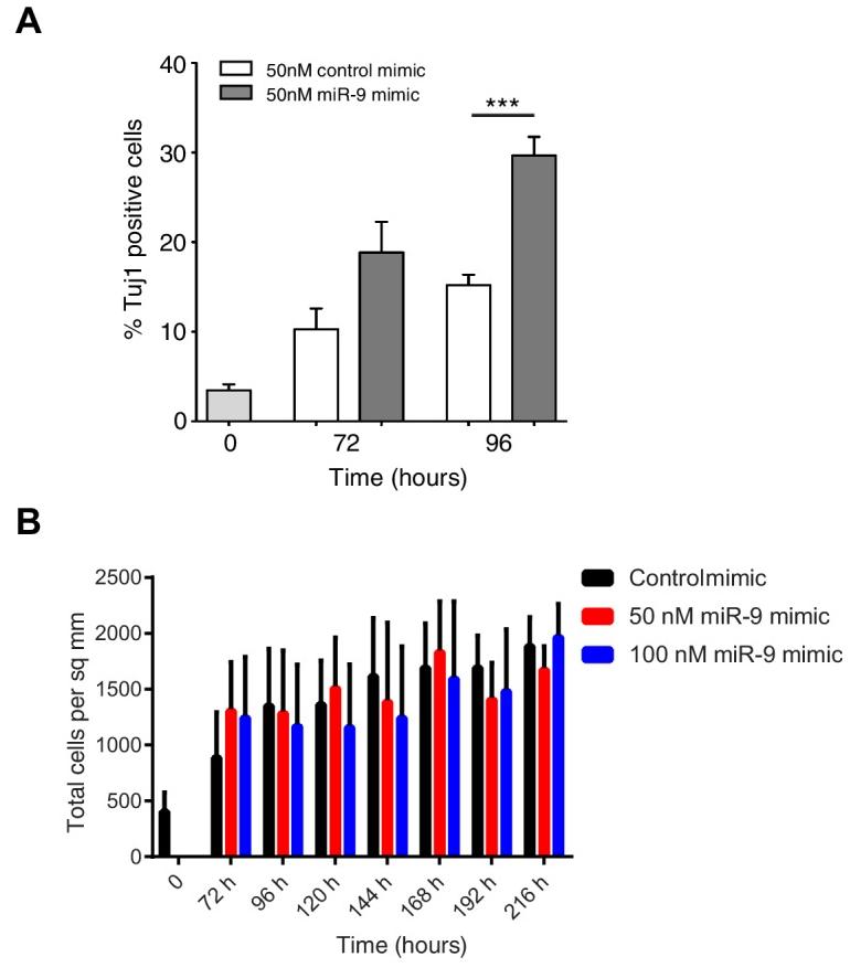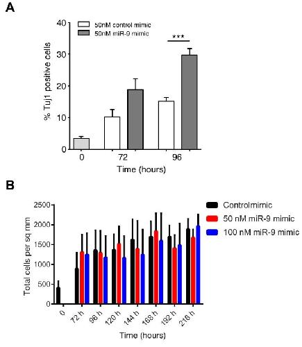 Figure 6—figure supplement 1. Increased miR-9 shifts timing of differentiation earlier in C17.2 neural progenitor cells. (A) Percentage of Tuj1 positive neurons in differentiated C17.2 cells after transfection of 50 nM miR-9 mimic or control mimic and culture in serum-free differentiation conditions. Significance tested in one-way ANOVA with Holm-Sidak multiple comparison correction. Significance: *p<0.05; **p<0.01; ***p<0.001. 5 images analysed per condition in 2 biological replicates. Error bars show S.E.M. (B) The density of cells after transfection of negative control mimic or 50 nM and 100 nM miR-9 mimic and culture in serum-free differentiation conditions. No differences within a given time point are statistically significant, where significance is tested in a two-way ANOVA with Tukey multiple comparison correction. Source data contained in Figure 6—source data 2. |