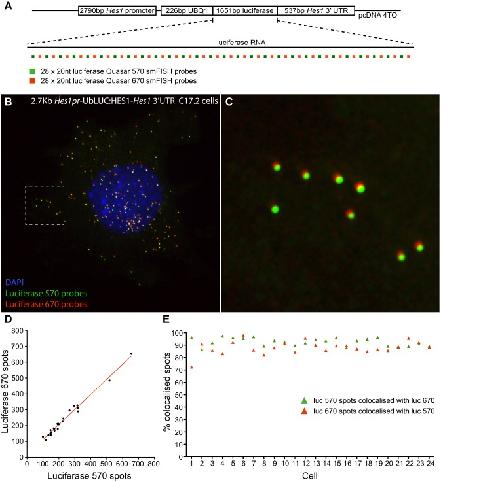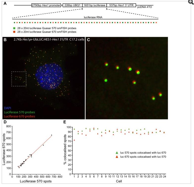 Figure 1—figure supplement 2. Validation of smFISH accuracy.(A) To test the reliability of smFISH for accurate single-cell RNA quantification, we analysed spot number detected by two interleaved smFISH probe sets (each comprising 28 x 20 nt probes), targeting luciferase RNAs expressed from a 2.7 kb-Hes1pr-UbLUC:HES1–Hes1 3’UTR construct stably transfected into C17.2 cells (generated in Goodfellow et al. [Goodfellow et al., 2014]). (B) Luciferase Quasar 570 and Quasar 670 smFISH probes simultaneously hybridized to luciferase RNAs in a C17.2 cell. (C) Zoom panel of the region highlighted in B, showing colocalisation of smFISH spots detected with each probe set; there is a slight chromatic shift between channels. (D) smFISH spots detected by each probe set were quantified in 24 cells using the 'analyze spots' function in Imaris. Linear regression analysis confirmed strong agreement in the RNA number detected by each probe set (slope = 0.95 ± 0.03, R2 = 0.98). (E) To test that the probe sets detected the same RNAs, colocalisation of detected spots was analysed between the two channels. A correction was applied in x, y and z to account for the chromatic shift between channels, then the Imaris XTension 'Spots Colocalize' was performed using a distance of 0.5 μM. This returned 92.5% colocalisation of Quasar 570 spots with Quasar 670 spots, and 88.0% colocalisation of Quasar 670 spots with Quasar 570. smFISH count data contained in Figure 1—source data 3.DOI: http://dx.doi.org/10.7554/eLife.16118.009 |