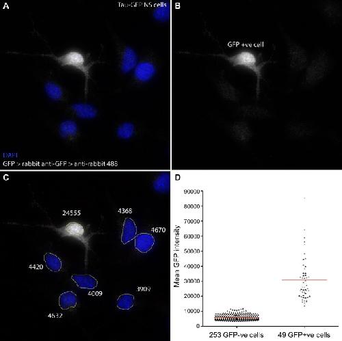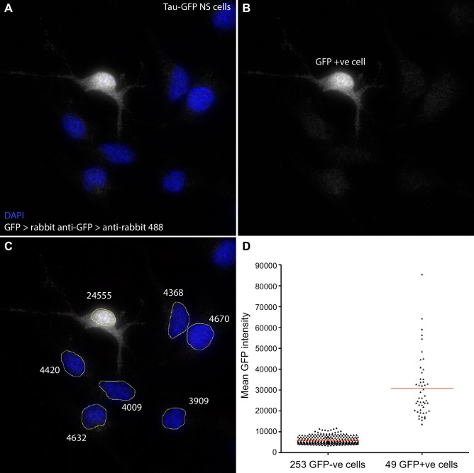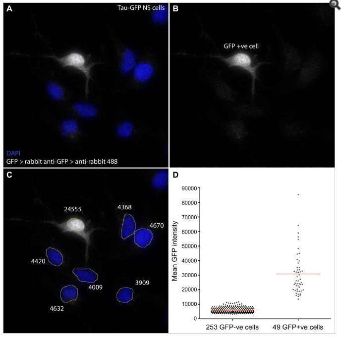 Figure 1âfigure supplement 3. Quantification of GFP signal intensity in Tau-GFP NS cells. Following smFISH in Tau-GFP NS cells, GFP protein was detected using anti-GFP primary (Life Technologies A11122) and goat anti-rabbit Alexa Fluor 488 secondary antibody (Life Technologies A11008). Z-stacks were sum projected in FIJI, nuclei manually segmented, and mean signal intensity (sum intensity/segmented area) measured. Cells with mean GFP intensity >12000 were classed as GFP positive. (A, B, C) Sample image of a field of Tau-GFP NS cells with DAPI stained nuclei (blue) and immunofluorescent detection of GFP (white). One cell has high mean GFP signal (24555, GFP+ve); other cells show only low signal (â¼4000) that may be due to autofluorescence and/or some non-specific antibody binding. (D) Mean GFP intensity measurements for all GFP-ve and GFP+ve cells analysed for Hes1 smFISH in Figure 1E, F. Source data contained in Figure 1âsource data 4. |