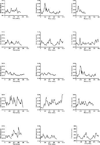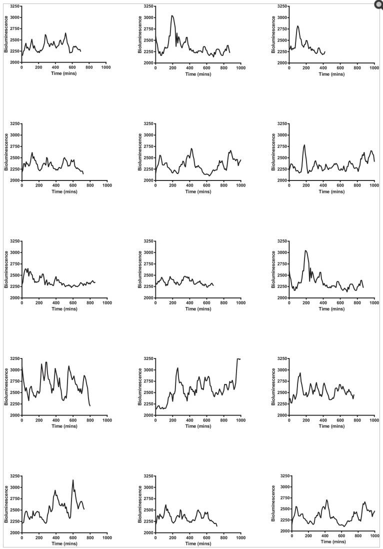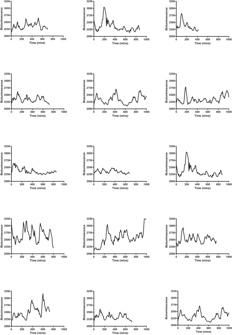 Figure 3âfigure supplement 2. Multiple single-cell time series of LUC2:HES1 reporter protein expression in primary NS cells determined by bioluminescence imaging. |