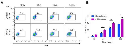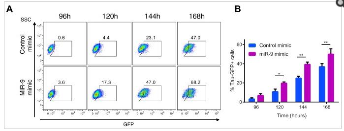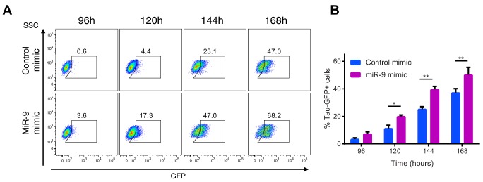 Figure 6âfigure supplement 2. Increased miR-9 shifts timing of differentiation earlier in NS cells. (A) Representative flow cytometry plots showing the percentage of GFP positive neurons during neuronal differentiation of Tau-GFP NS cells after transfection of 40 nM miR-9 mimic or control mimic. Time-points represent hours after the onset of neuronal differentiation. SSC: side scatter (B) Frequency of GFP positive neurons following treatment of Tau-GFP NS cells with 40 nM miR-9 mimic or control mimic (n=5 biological replicates). Significance tested in one-way ANOVA with Holm-Sidak multiple comparison correction. Significance: *p<0.05; **p<0.01; ***p<0.001.Error bars show S.E.M. Source data contained in Figure 6âsource data 3. |
