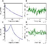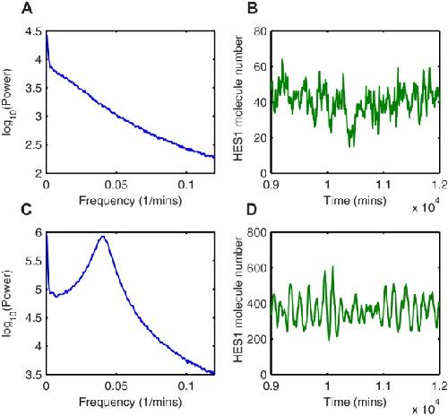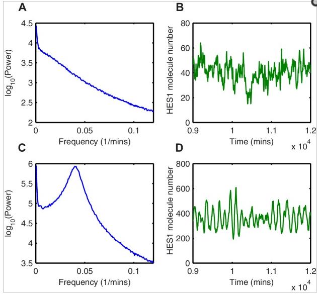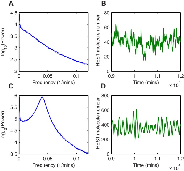 Figure 7âfigure supplement 2. Random fluctuations are distinct from stochastic oscillations. (A, C) The power spectrum of HES1 protein oscillations calculated using the average of 1000 simulations with the dSSA (blue), for m1 = 3.5, r1 = 600 and m1 = 1.5, r1 = 600, respectively. (B, D) HES1 protein dynamics after the accumulation of miR-9 simulated with the dSSA to (A) and (C), respectively. |