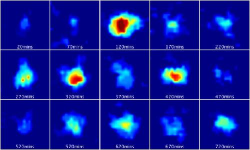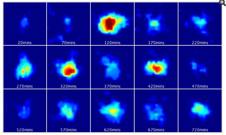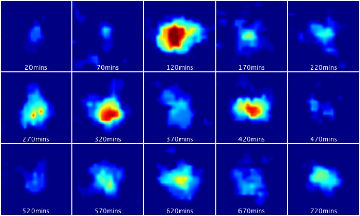 Figure 3âfigure supplement 1 Bioluminescence images from a single primary LUC2:HES1 NS cell cultured in proliferative conditions. Corresponds to single-cell LUC2:HES1 time-series data shown in Figure 3A. 16 colours look-up table was used from ImageJ where hot (red) colours show high intensity and cold (blue) colours show low intensity. |