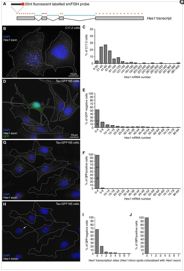 Figure 1. Absolute quantification of mRNA copy number and active transcription sites. (A) Schematic showing the mouse Hes1 primary transcript, with 29 smFISH probes targeting exonic sequence (red) and 38 smFISH probes targeting intronic sequence (blue). (B) smFISH for Hes1 mRNA (white) in C17.2 cells; nuclei are stained with DAPI (blue). (C) Quantification of Hes1 mRNA number in C17.2 cells (n=103). (D) smFISH for Hes1 mRNA (white) in Tau-GFP NS cells; nuclei are stained with DAPI (blue), and GFP protein is stained with rabbit anti-GFP > anti-rabbit Alexa Fluor 488 (green). The field contains one GFP positive cell, as determined by GFP immunofluorescence intensity analysis (Figure 1âfigure supplement 3). (E) Quantification of Hes1 mRNA number in GFP negative NS cells (n=253). (F) Quantification of Hes1 mRNA number in GFP positive neuronal differentiated NS cells (n=49). (G, H) Double smFISH for Hes1 mRNA (G) and Hes1 intron (H) in the same Tau-GFP NS cells; arrow indicates an active transcription site, marked by colocalised exonic and intronic Hes1 smFISH signals in the nucleus. (I, J) Quantification of Hes1 active transcription sites in GFP negative NS cells (I, n=253) and in GFP positive neuronal differentiated NS cells (J, n=49). Source data contained in Figure 1âsource data 1. |