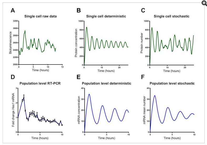 Figure 3. Stochastic simulations of HES1 oscillations match the experimental data better. (A) Time series of LUC2:HES1 reporter protein expression in a single primary NS cell determined by bioluminescence imaging. (B) Deterministic simulation of Hes1/miR-9 network at a single-cell level, plot shows HES1 protein concentration as a function of time. (C) Stochastic simulation of Hes1/miR-9 network with the dSSA at a single cell level. (D) q-PCR quantification of endogenous Hes1 mRNA in C17.2 cells at the population level following serum synchronization. Error bars show S.E.M of 2 technical replicates of 2 biological experiments. (E) Population level deterministic simulation of Hes1/miR-9 network through averaging 2000 single-cells, with Hes1 mRNA shown as a function of time. (F) Population level stochastic simulation of Hes1/miR-9 network with the dSSA and averaging over 2000 cells, with Hes1 mRNA shown as a function of time. All simulations performed with parameter set 1 (Appendix 1âtable 1) with system size Ï = 1 and initial conditions m(0) = p(0) = r(0) = 0. Note that the computational simulations are less damped than the experimental data, presumably because other sources of variability in experimental data lead to greater damping. MATLAB code and experimental data contained in Figure 3âsource data1. |