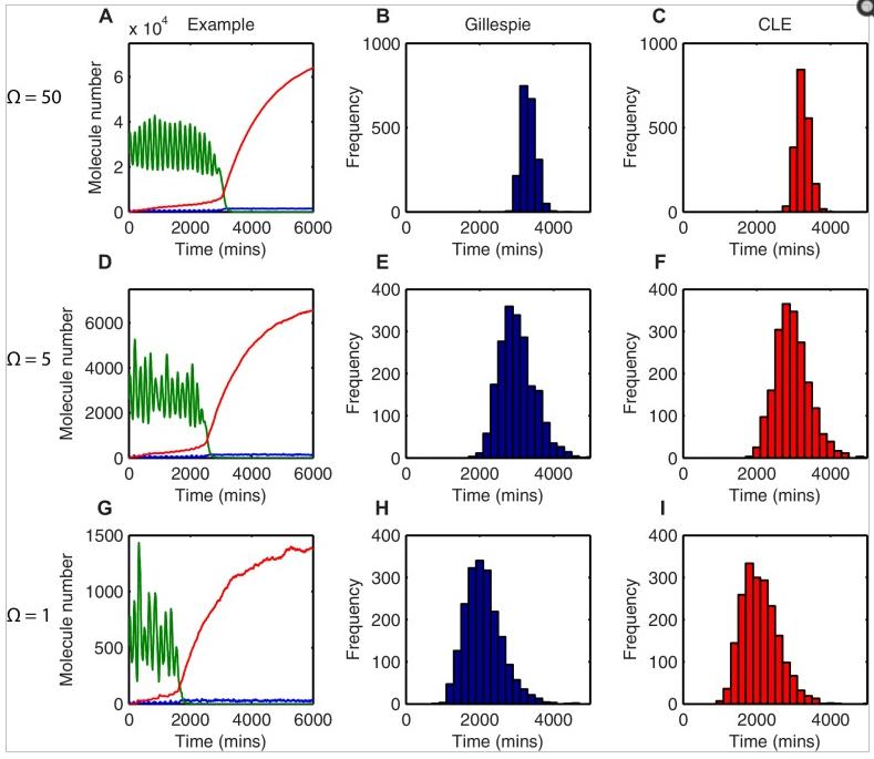 Figure 4. The distribution of time-to-differentiation widens at low system sizes. (A, D, G) Examples of stochastic simulations using the dSSA at Ï=50, 5 and 1, respectively. Blue, mRNA; green, protein; red, miR-9. (B, E, H) The distribution of times to reach the low HES1 protein state of 2000 simulations using the dSSA. (C, F, I) The distribution of times to reach the low HES1 protein state of 2000 simulations using the CLE. Note that even at low system size, the CLE is in excellent agreement with the Gillespie dSSA, which is consistent with previous studies showing that the CLE can be highly accurate when reactions only involve the creation or degradation of one species and act to either increase or decrease the molecule number by one (Grima et al., 2011) and confirms the results. All simulations performed with parameter set 2 (Appendix 1âtable 1) and initial conditions m(0) = 20xÏ, p(0) = 400xÏ and r(0) = 0. MATLAB code contained in Figure 4âsource data 1. |