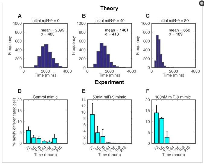 Figure 6. The spread of time-to-differentiation decreases in both the computational model and experiments with increased initial miR-9. (A, B, C) The distribution of times to reach the low HES1 state of 3000 simulations using initial conditions of miR-9 r(0) = 0, 40 and 80, respectively. The initial conditions of mRNA and protein were m(0) = 20xÏ, p(0) = 400xÏ. All simulations performed with parameter set 2 (Appendix 1âtable 1) with system size Ï = 1 and using the CLE. (D, E, F) Newly differentiated Tuj1 positive C17.2 cells compared to previous time point as a percentage of the population. Cells were transfected with 100 nM control mimic or 50 nM and 100 nM miR-9 mimic, respectively. Cells were cultured in serum-free differentiation conditions for the time shown. 5 images analysed per condition in at least 2 experiments. MATLAB code and experimental data contained in Figure 6âsource data 1. |