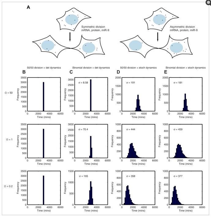 Figure 9. Stochastic system is robust to the binomial distribution of constituents at cell division. (A) Schematic to show the difference between symmetric and asymmetric division. (B) The distribution of time to reach the low HES1 state with 50/50 initial conditions using deterministic dynamics as system size of Ï = 50, 1 and 0.2, respectively. (C) The distribution of times to reach the low HES1 state of 3000 simulations with binomial initial conditions using deterministic dynamics at system size of Ï = 50, 1 and 0.2, respectively. (D) The distribution of times to reach the low HES1 state of 3000 simulations with 50/50 initial conditions using the CLE at system size of Ï = 50, 1 and 0.2, respectively. (E) The distribution of times to reach the low HES1 state of 3000 simulations with binomial initial conditions using the CLE at system size of Ï = 50, 1 and 0.2, respectively. All simulations performed with parameter set 2 (Appendix 1âtable 1) and initial conditions m(0) = 20xÏ, p(0) = 400xÏ and r(0) = 0. The standard deviation of the distribution is denoted with Ï. In the simulations shown, parent cells were simulated deterministically for 12âhr prior to 'division' however, the distributions remained statistically the same (p-value>0.05) when either 11 or 13âhr deterministic simulations prior to division were used (data not shown). MATLAB code contained in Figure 9âsource data 1. |