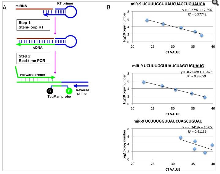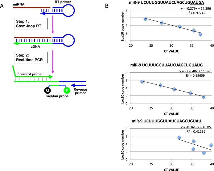 Figure 1âfigure supplement 4. Method to quantify miR-9 copy number. (A) Diagram showing the process of microRNA reverse transcription (Applied Biosystems TaqMan microRNA Reverse Transcription kit (4366596)) and TaqMan qRT-PCR (TaqMan Fast Advanced master mix reagent (Applied Biosystems 4444557)) using ThermoFisher Scientificâs stem loop primer for mouse miR-9-5p (product 4427975, assay ID 001089). (B) Graphs showing the efficacy of the stem loop primers to reverse transcribe the synthetic mature miR-9 variants as described on miRBase (accession MI0000157, deep sequencing mmu-miR-9-5p accession MIMAT0000142). Only the two longest forms, miR-9 UAUGA and miR-9 UAUG, are reliably reverse transcribed for amplification. This is highlighted by the high R2 values and by all points of the curve residing on the trend line. The third graph is representative of the other 3 truncated forms tested (miR-9 UAU, UA and U) |