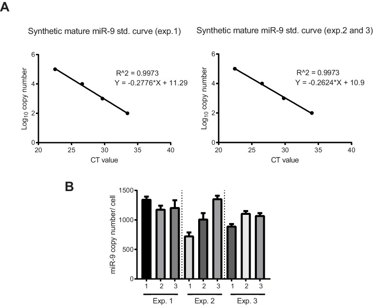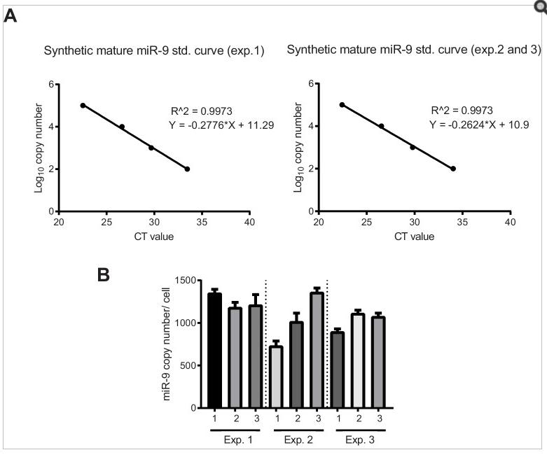Figure 1—figure supplement 5. Quantification of miR-9 copy number. (A) Graphs showing qPCR standard curves generated from known concentrations of synthetic mature miR-9 (3 biological experiments) and linear regression. (B) Graph showing the number of miR-9 molecules per cell in C17.2 progenitors extrapolated from the synthetic miR-9 standard curve in the equivalent biological experiment. 3 technical replicates per biological experiment were analysed. Error bars show S.D of 10 identical samples per technical replicate. The mean and S.E.M (including all samples) is 1100 ± 20 (S.E.M) molecules per cell. Source data contained in Figure 1—source data 5. |