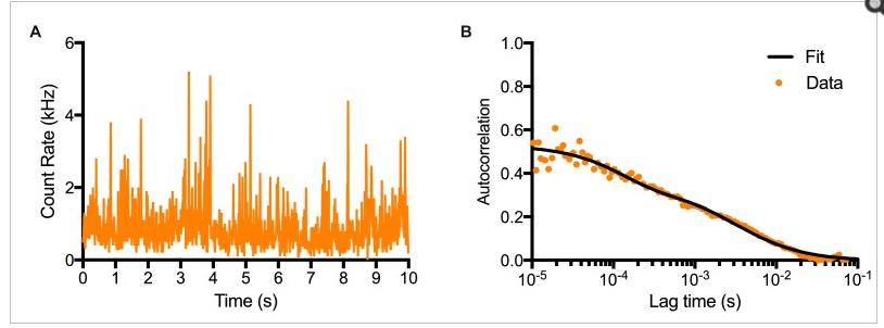 Figure 2âfigure supplement 1. Fluorescence Correlation Spectroscopy technique. (A) Time-series of Venus intensity fluctuations recorded in the confocal volume in NS-E UbC-VENUS:HES1 cells. (B) Auto-correlation function of time-series (A) and data fitting with a two-component model with triplet state. |