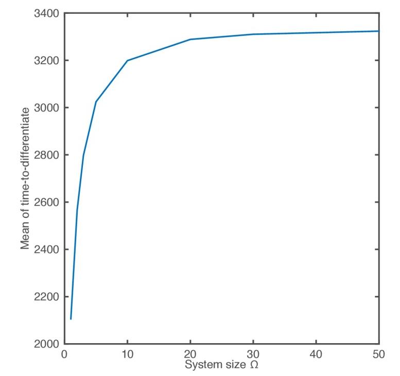 Figure 4—figure supplement 1. The mean of the time-to-differentiate as a function of the system size. |