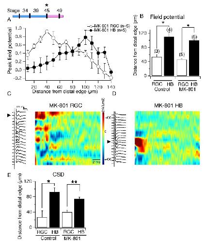 Figure 7. NMDA receptor blockade, starting at stage 45, does not disrupt the normal degree of spatial segregation between RGC and HB synaptic inputs.(Top, left) Timeline of experiment. (A) Average normalized peak FPs of RGC-evoked (white) and HB-evoked (black) inputs along the laminar axis of MK-801-reared tadpoles. The spatial FP profiles show distinct and separated peaks formed by RGC and HB inputs. (B) Average distance from the distal edge at which the largest RGC-evoked and HB-evoked FP amplitudes occurred in control and MK-801-reared tecta. (C) RGC-evoked FPs with corresponding image plot showing the largest RGC-evoked sink localized to the most distal region of the laminar axis. (D) HB-evoked FPs with corresponding image plot showing the largest HB-evoked sink localized to the proximal region of the laminar axis. (E) Bar graph summarizing the location of major RGC- and HB- evoked CSD sinks along the distal-proximal axis. For both control tecta and tecta exposed to MK-801 at stage 45, the distance separating the major RGC- and HB-evoked CSD sinks is significant.DOI: http://dx.doi.org/10.7554/eLife.20502.009 |