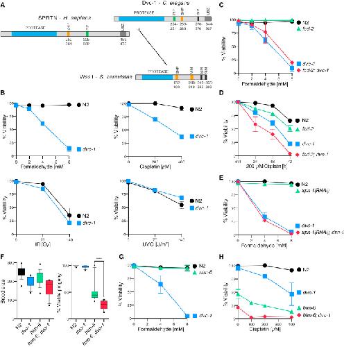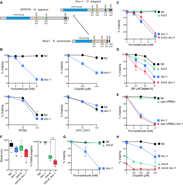 Figure 1. SPRTN/Dvc-1 Provides Resistance toward DPC-Inducing Agents in Worms and Operates Independently of FANCD2/Fcd-2 and Parallel to BLM/Him-6(A) Domain structures and evolutionary distances of the protease domain of SPRTN/Wss1 protease family members of humans, worms, and budding yeast. SPRTN/Wss1 proteases bear interaction domains for p97/Cdc48 (SHP-box, VIM), recognition modules for ubiquitin (UBZ) or SUMO (SIM), and in metazoans a PCNA-interaction motif (PIP-box).(B) C. elegans mutant strains lacking functional SPRTN (dvc-1) are specifically sensitive to the DPC-inducing agents. Formaldehyde sensitivity was determined in synchronized L1 larvae. Cisplatin, UVC light, and IR sensitivities were assessed by measuring embryonic survival of progeny after exposure of adult animals. Error bars indicate SEM of –two to four independent experiments.(C) FANCD2 is not involved in providing formaldehyde resistance in synchronized L1 larvae. Error bars indicate SEM of two independent experiments.(D) FANCD2 provides resistance to chronic cisplatin exposure by a mechanism distinct to DPC repair by SPRTN. Viability was assessed by determination of embryonic survival of progeny of young adult animals kept on cisplatin-containing plates (200 μM) for the indicated amount of time. Error bars indicate SEM of two independent experiments.(E) Loss of XPA does not result in increased formaldehyde sensitivity in synchronized L1 worms. Error bars indicate SEM of two independent experiments.(F) Loss of SPRTN (dvc-1) results in viability defects in worms lacking the BLM helicase (him-6). Data were obtained from at least 16 animals per indicated genotype. Whiskers indicate tenth to 90th percentiles. Statistical significance was tested using an unpaired t test.(G) The BLM helicase (Him-6) is not involved in providing formaldehyde resistance in synchronized L1 larvae. Error bars indicate SEM of two independent experiments.(H) BLM (Him-6) provides resistance to cisplatin exposure by a mechanism parallel to DPC repair by SPRTN. Cisplatin sensitivity was assessed by measuring embryonic survival of progeny after exposure of adult animals. Error bars indicate SEM of two independent experiments.See also Figure S1.