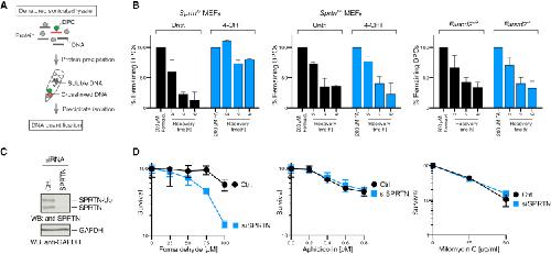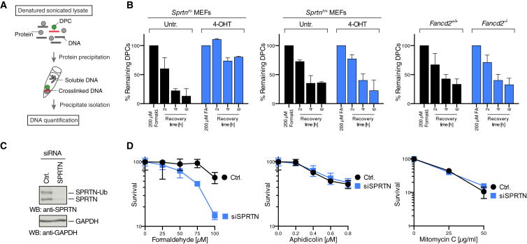Figure 2. SPRTN-Deficient Mammalian Cells Fail to Repair DPCs and Are Hypersensitive toward DPC-Inducing Agents(A) Schematic representation of the KCl/SDS precipitation assay used to measure DPC repair. Cells are lysed in denaturing conditions (1% SDS), followed by sonication and precipitation of cellular protein by the addition of KCl. Crosslinked DNA co-precipitates with the protein, whereas free DNA remains in the supernatant. The precipitate is washed several times before quantification of soluble and crosslinked DNA.(B) SPRTN-deficient MEFs fail to repair formaldehyde-induced DPCs. SprtnF/−, SprtnF/+ (untreated or treated with 4-hydroxy tamoxifen [4-OHT] for 48 hr), Fancd2+/+, and Fancd2−/− MEFs were treated with 200 μM formaldehyde (FA) for 1 hr to induce DPCs and lysed directly or allowed to repair. DPCs were measured as the ratio of crosslinked DNA compared to total DNA. Error bars indicate SEM of two independent experiments.(C and D) Knockdown of SPRTN results in formaldehyde sensitivity in human cells. Relative cell numbers were determined 6 days after U2OS cells transfected with SPRTN or control siRNA were treated with the indicated doses of formaldehyde, aphidicolin, or mytomicin C. Error bars represent SD of two to four replicates.See also Figure S2.