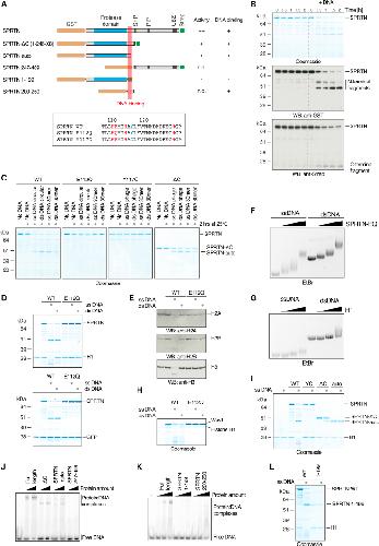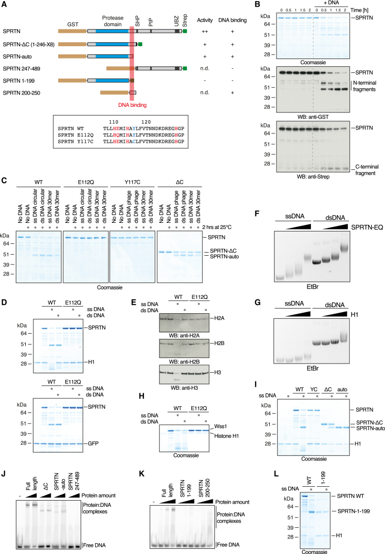 Figure 3. A DNA Switch Controls SPRTN’s Protease Activity(A) Schematic representation of recombinant GST-SPRTN-Strep variants (upper panel). Sequence of SPRTN’s active site with catalytic residues in red and tyrosine-to-cysteine replacement found in RJALS patients in blue (lower panel) are shown.(B) Autocatalytic cleavage of SPRTN is induced by DNA. SPRTN (180 nM, N-terminally GST tagged, C-terminally Strep tagged) was incubated in the absence or presence of circular ssDNA (ΦX174 virion, 10 nM).(C) Autocatalytic cleavage of SPRTN is induced by various types of DNA. GST-SPRTN-Strep (WT, E112Q, or the disease variants Y117C and ΔC, 180 nM) was incubated in the presence of different types of DNA (phage DNA [10 nM], 30-mer oligonucleotides [1.8 μM]) for 2 hr at 25°C.(D and E) SPRTN cleaves DNA-binding proteins in an ssDNA-dependent manner. GST-SPRTN-Strep (WT or the catalytically inactive E112Q variant, 480 nM) was incubated with the indicated substrates (360 nM) in the absence or presence of ss and ds phage DNA (10 nM) for 2 hr at 25°C.(F and G) SPRTN and histone H1 bind similarly to ss and ds phage DNA. Proteins (SPRTN [0.45, 0.9, and 1.8 μM] and H1 [2, 3, and 4 μM]) were incubated with DNA (50 nM) and analyzed on 0.8% agarose gels.(H) Wss1 cleaves histone H1 in an ssDNA-dependent manner. Wss1 (WT or the catalytically inactive E116Q variant, 800 nM) histone H1 (200 nM) were incubated with the indicated type of DNA (10 nM) for 2 hr at 30°C.(I) SPRTN disease variants display defects in ssDNA-dependent substrate cleavage. GST-SPRTN-Strep (WT, Y117C, ΔC or auto, 480 nM) was incubated with histone H1 (360 nM) in the absence or presence of ss phage DNA (10 nM) for 2 hr at 25°C.(J) C-terminally truncated SPRTN variants retain the ability to bind DNA. Indicated proteins (500 nM and 1 μM) were incubated with a fluorescently labeled ss oligonucleotide (250 nM) prior to gel electrophoresis in 6% PAGE gels.(K) SPRTN’s DNA-binding domain resides within aa 200–250. Indicated proteins (0.25, 0.5, and 1 μM) were incubated with a fluorescently labeled ss oligonucleotide (250 nM) prior to gel electrophoresis in 6% PAGE gels.(L) SPRTN deficient for DNA binding is deficient for ssDNA-dependent substrate cleavage. Recombinant GST-SPRTN-Strep (WT or 1–199, 480 nM) was incubated with recombinant histone H1 (360 nM) in the absence or presence of ss phage DNA (10 nM) for 2 hr at 25°CSee also Figure S2.
