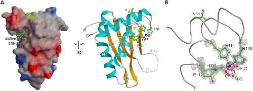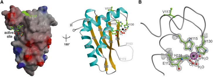 Figure 4. Crystal Structure of the Protease Domain of SPRTN’s Fission Yeast Homolog(A) Structure of the protease domain of S. pombe Wss1b (PDB: 5JIG) in a surface (left) or cartoon (right) representation. Active site residues are displayed as sticks. Position 117 mutated in RJALS to a cysteine is highlighted in green. Numbering of residues corresponds to the human sequence.(B) Close-up view of the active site showing the octahedral coordination of Ni2+ by His111, His115, His130, as well as one oxygen and two water molecules. The 2FO-FC electron density map is contoured to 1σ, whereas the anomalous density (magenta) for Ni2+ is contoured to 10σ. Most likely the catalytic zinc atom has been replaced during the Ni2+-affinity chromatography step.See also Figure S3.