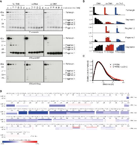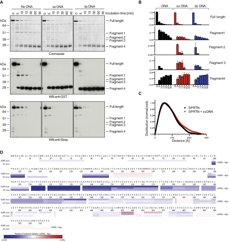 Figure 5. DNA Binding Induces a Conformational Change within SPRTN(A) SPRTN undergoes a conformational change upon DNA binding. Catalytically inactive GST-SPRTN-Strep E112Q was subjected to limited proteolytic digestion by trypsin in the presence or absence of ssDNA or dsDNA.(B) Quantification of specific proteolytic fragments observed in (A). Values represent mean ± SEM of three independent experiments.(C) SAXS analysis indicates that ssDNA binding increases the flexibility of SPRTN. Electron pair distribution shows an increase in Rg and Dmax upon ssDNA (15-mer) binding.(D) Heatmap showing H/D exchange mass spectrometry indicating differences in deuterium incorporation between SPRTN and SPRTN + ssDNA. Regions of increased protection are shown in blue and increased exposure in red. Deuterium labeling was carried out at three time points (0.3, 3, and 30 s) in triplicates.See also Figure S4.