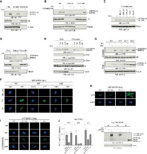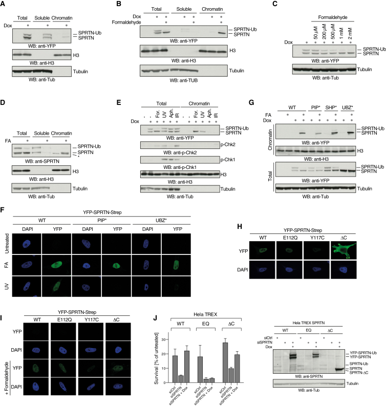 Figure 6. Chromatin Access of SPRTN Is Controlled by a DPC-Triggered Ubiquitin Switch(A) Mono-ubiquitinated SPRTN is excluded from chromatin. Doxycycline-inducible YFP-SPRTN-Strep HeLa Flp-In TRex cells were either lysed directly in SDS-containing loading dye (total) or subjected to fractionation in soluble and chromatin components.(B) Formaldehyde treatment induces deubiquitination of SPRTN coinciding with a complete relocalization to chromatin. Doxycycline-inducible YFP-SPRTN-Strep HeLa Flp-In TRex cells were treated with 1 mM formaldehyde (FA) for 2 hr.(C) SPRTN is deubiquitinated upon formaldehyde exposure in a dose-dependent manner. Doxycycline-inducible YFP-SPRTN-Strep HeLa Flp-In TRex cells were treated for 2 hr with the indicated dose of formaldehyde.(D) Endogenous SPRTN is deubiquitinated and relocalizes to chromatin formaldehyde exposure. U2OS cells were treated with 1 mM formaldehyde (FA) for 2 hr. Asterisk indicates an unspecific band.(E) Deubiquitination of SPRTN is specifically triggered by DNA-protein crosslinks. Doxycycline-inducible YFP-SPRTN-Strep HeLa Flp-In TRex cells were treated with formaldehyde (FA, 1 mM, 2 hr), UVC light (UV, 20 J/m2, 2 hr before lysis), aphidicolin (Aph, 1 μM, 2 hr), or IR (3 Gy, 2 hr before lysis).(F) SPRTN is differentially recruited to chromatin depending on the type of DNA damage. Doxycycline-induced YFP-SPRTN-Strep HeLa Flp-In TRex cells were treated with formaldehyde (FA, 0.5 mM) or UV (20 J/m2) and subjected to pre-extraction, prior to fixation and immunofluorescence.(G) SPRTN deubiquitination and chromatin recruitment upon DPC induction is independent of binding to PCNA, p97, or ubiquitin. Doxycycline-inducible YFP-SPRTN-Strep HeLa Flp-In TRex cells expressing the indicated SPRTN variants were treated with 1 mM formaldehyde (FA) for 2 hr.(H) SPRTN-ΔC displays an aberrant subcellular localization. Doxycycline-induced YFP-SPRTN-Strep HeLa Flp-In TRex cells were analyzed using immunofluorescence.(I) SPRTN-ΔC is recruited to chromatin upon the induction of DPCs. Doxycycline-induced YFP-SPRTN-Strep HeLa Flp-In TRex cells were treated with formaldehyde (FA, 0.5 mM) and subjected to pre-extraction, prior to fixation and immunofluorescence.(J) SPRTN-ΔC complements the formaldehyde sensitivity of SPRTN-deficient cells only partially. HeLa Flp-In TRex cells bearing the indicated doxycycline-inducible YFP-SPRTN-Strep alleles were transfected with siRNA against endogenous SPRTN and incubated in the absence or presence of doxycycline for 48 hr. Cells were then treated for 48 hr with 100 μM formaldehyde, and cell numbers were determined after an additional 4-day incubation. Values indicate cell numbers relative to untreated cells. Error bars represent SD of two to four replicates. Knockdown and doxycycline induction were confirmed by western blotting. Please note that autocleavage bands appear at similar positions as endogenous SPRTN in cells expressing WT YFP-SPRTN.See also Figure S5.
