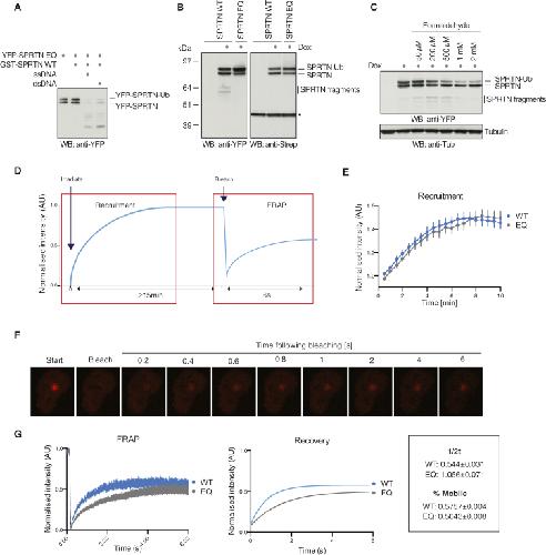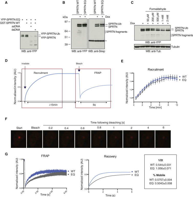 Figure 7. Autocleavage Controls SPRTN Dynamics at Sites of DNA Damage(A) SPRTN autocleavage occurs in trans. Recombinant GST-SPRTN-Strep WT and catalytically inactive YFP-E112Q-Strep were incubated in the absence or presence of ss and ds phage DNA (10 nM) for 2 hr at 25°C.(B) SPRTN autocleavage occurs in cells. Doxycycline-inducible YFP-SPRTN-Strep HeLa Flp-In TRex cells expressing the indicated SPRTN variants were lysed and subjected to SDS-PAGE followed by western blotting against the N-terminal YFP and the C-terminal Strep tag. The asterisk indicates an unspecific band serving as loading control.(C) SPRTN autocleavage is triggered by formaldehyde. Doxycycline-inducible YFP-SPRTN-Strep HeLa Flp-In TRex cells were treated with the indicated dose of formaldehyde for 2 hr.(D) Schematic representation shows laser microirradiation and fluorescence recovery after photobleaching (FRAP) experiments.(E) Recruitment of YFP-SPRTN-Strep (WT or EQ) in HeLa Flp-In TRex cells after laser microirradiation. Data are from ≥20 cells ± SEM normalized to pre-irradiation fluorescence.(F) Representative images of HeLa Flp-In TRex cells expressing WT YFP-SPRTN-Strep from FRAP time course at indicated time following bleaching. Bleaching was achieved with 0.1-s pulse of 405-nM laser (scale bar, 10 μm).(G) FRAP from HeLa Flp-In TRex cells expressing YFP-SPRTN-Strep (WT or EQ) data are from ≥15 cells ± SEM normalized to pre-bleach fluorescence (left panel). Fitted exponential fluorescence recovery of FRAP data is shown (right panel).