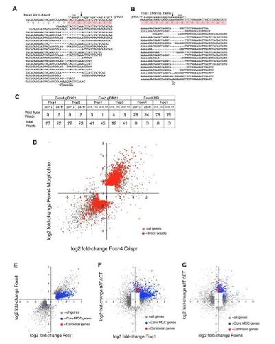 kb of the TSS, based on ChIPseq analysis. (E-G) Scatter plots of genes based on log2-fold change in expression (P<0.05) in RNAseq analysis of progenitors induced to under MCC differentiation by Multicilin, in the presence and absence of E2f4δCT to disable the EDM complex (F,G), with Cas9/Foxj1gRNA1 to mutate foxj1 (E,F) or with Cas9/Foxn4gRNA1 to mutate foxn4 (E,G). All genes changes with P<0.05 are indicated in gray, MCC core genes defined in Quigley and Kintner (2016 preprint) are in blue, and genes associated with centriole biogenesis are in red (Ma et al., 2014).