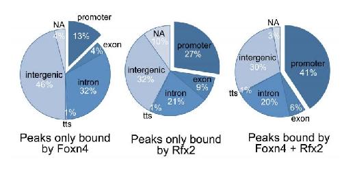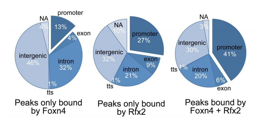 The piecharts show the genomic annotations of peaks bound by Foxn4 alone, Rfx2 alone,