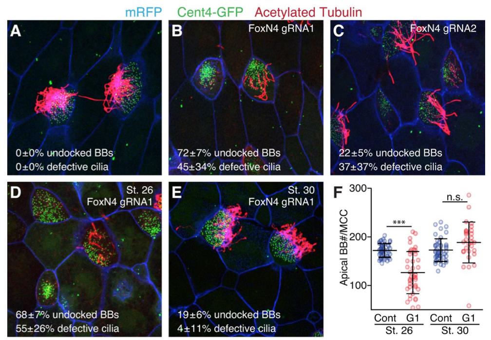 foxn4 Cas9/CRISPR phenotypes. (A-C) Representative confocal images of the skin in stage 26 wild-type control embryos (A) or embryos injected with Cas9 along with two independent gRNAs directed against foxn4 (B,C). Cell membranes (mRFP, blue), basal bodies (Centrin4-GFP, green) and cilia (acetylated tubulin, red) are labeled as in Fig. 1. (D,E) Representative confocal images of the skin of embryos at stage 26 or stage 30, following injection with Cas9 protein and Foxn4gRNA1. Cell boundaries (blue), basal bodies (green) and cilia (red) are labeled as above. (A-E) The percentage of MCCs (±s.d.) with defective cilia or undocked basal bodies is indicated based on scoring at least 12 fields from different embryos (nâ¥50 cells). (F) Scatter plot of basal body number located within 1â